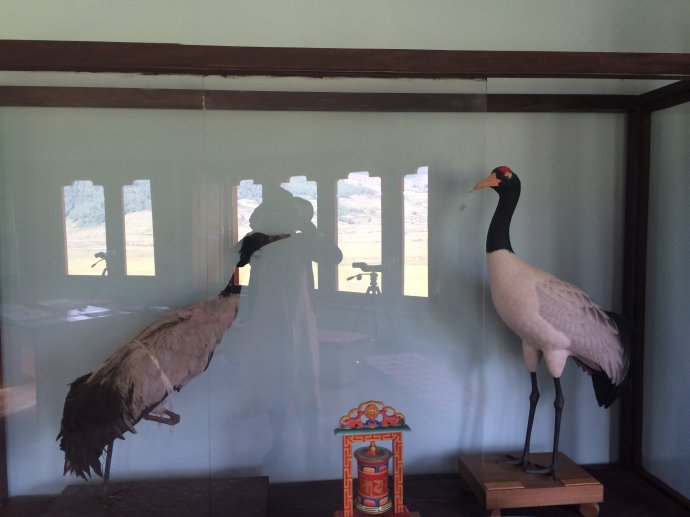 岗提位于富毕卡山谷,谷底有片沼泽湿地,每年的秋冬季节,会有四百多只来自西藏高地区的黑颈鹤在这里栖息,此时还没有来,我们只是在其管理中心看了介绍它们在此生活的记录片,我拍的这一张是其标本和仿造品: