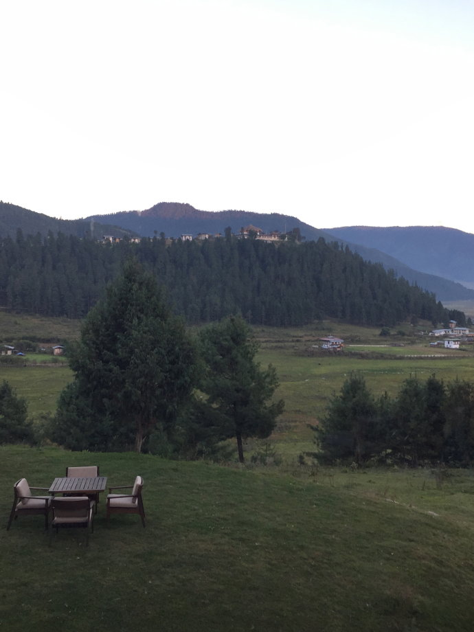 上午参观完岗提寺,拄杖穿过半山腰间的不丹国树——柏树林,到达一大片开阔的草地上喝茶。此时油然想起的是苏东坡的诗:“莫听穿林打叶声,何妨吟啸且徐行。竹杖芒鞋轻胜马,谁怕?”“料峭春风(此时应是秋风了)吹酒醒,微冷,山头斜照却相迎。”呵呵。如果没读千卷书,行万里路也就如同邮差了。